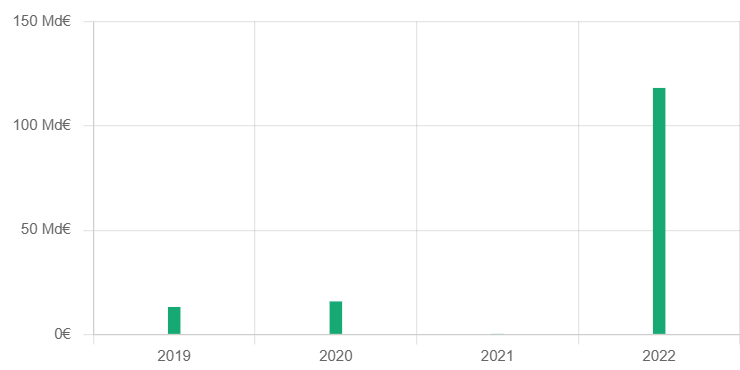 | Produits d'exploitation | 118.16 Md€ 22.14 K % | 531.41 M€ -96.65 % | 15.85 Md€ 20.09 % | 13.2 Md€ 0 % |